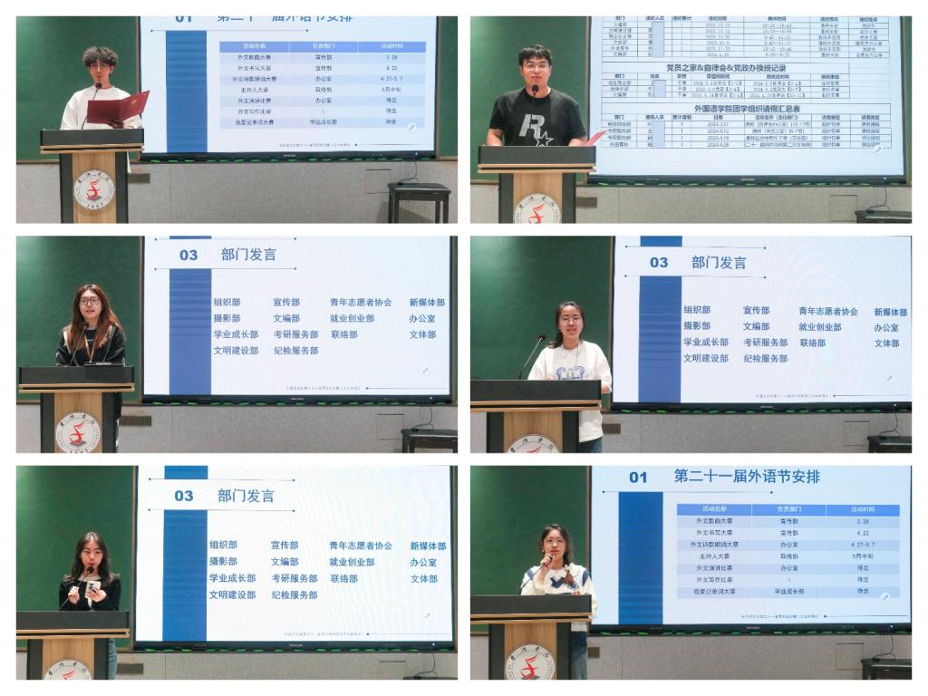 会议第二个议程是团学全体例会。各部门结合近期外语节工作部署作部门汇报,并结合自己部门的工作提炼经验与总结不足。