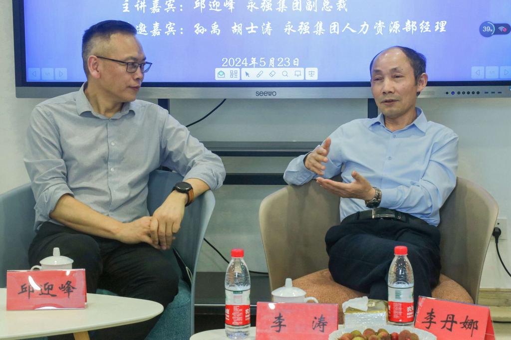 会上,邱迎峰分享了自己在外企就业时的经历以及在永强集团的职业发展历程,强调持续学习的重要性。问答环节,他针对面试选拔标准、简历制作技巧等提供建议,指出应届生实习经历的重要性,并鼓励同学们保持职场热情。对于AI替代风险,他认为创意性、互动性强的岗位不易被替代,鼓励同学们提高创新能力和自身硬能力。最后,李丹娜总结发言,强调持续学习、积极面对挑战和提升个人能力的重要性。