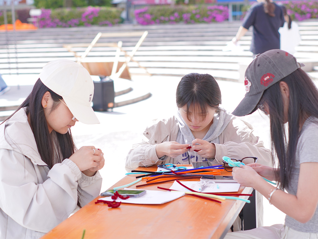 有的同学将粉色扭扭棒弯折成花瓣,绿色扭扭棒缠绕为花茎;有的同学则以鲜艳的红色扭扭棒弯出多边形镜框,再用黄色扭扭棒缠绕边缘,红黄搭配,色彩夺目,很快,栩栩如生的眼镜框便制作完成。从娇艳的花朵,到可爱的动物玩偶,再到创意十足的饰品,每一件作品都凝聚着同学们的智慧与巧思。