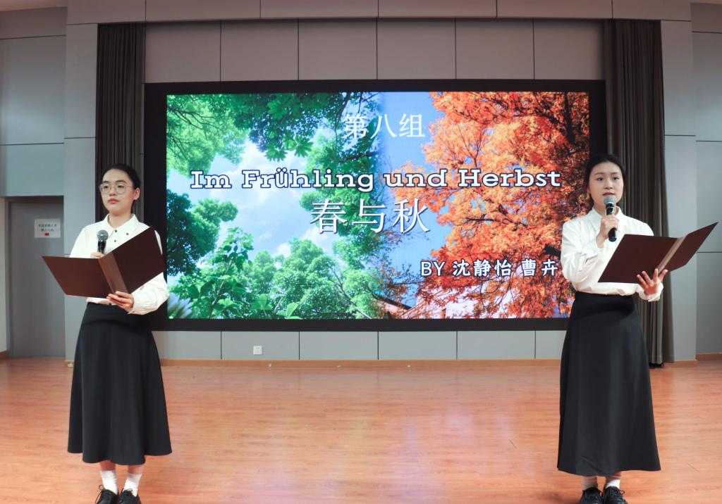 比赛正式开始,选手们依次自我介绍并表达对自身的期许。之后,各组选手依次上场,英语组的同学们以充满青春热情的声音致敬经典,展现了优越的学科素养和语音语调,将诗歌情感诠释得淋漓尽致。德语组的选手们将经典的诗歌以巧妙的方式连接,创造性地完成感情色彩的转变。每一位选手都将自身语言优势发挥到极致,让全场观众在思维的跳跃中感受经典诗歌的魅力。