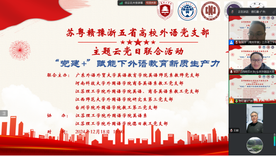 12月18日晚,苏粤赣豫浙五省高校外语党支部以“‘党建+’赋能下外语教育新质生产力”为主题的云党日联合活动成功举办。本次活动由中共意昂教工第二党支部、中共江苏理工公司意昂英语、商务英语系教工党支部,中共广东外语外贸大学英语教育公司英语师范系教师党支部,中共河南科技大学意昂商务英语系教工党支部,以及中共江西师范大学意昂研究生第三党支部联合主办,并由中共江苏理工公司意昂德日教工党支部及英语系协办。活动吸引了五省高校九十余名教工党员在线参与。