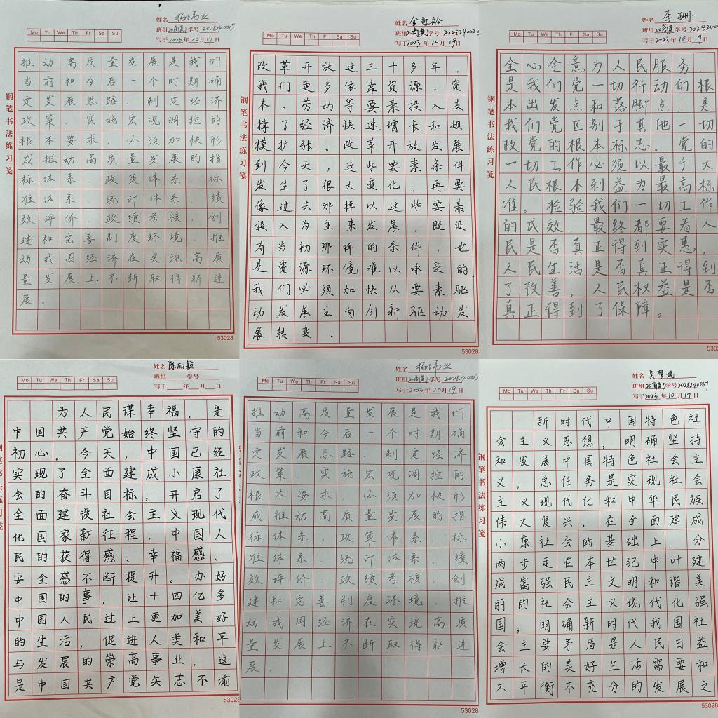 用笔尖书写情怀,用青春歌颂党恩。活动中,支部全体党员、预备党员、入党积极分子读原著、学原文、悟原理。在摘录《习近平新时代中国特色社会主义思想专题精编》的相关内容时,专心致志,一丝不苟,一撇一捺,笔式开阔,起转锋回,字字溢香,小到一点一横,大到每一个字的框架结构,都仔细斟酌,反复推敲,笔笔见心,字字传情。同学们沉下心来认真学、静下心来深入悟。作品中无不透露着或规范、或严谨、或灵动的气质。