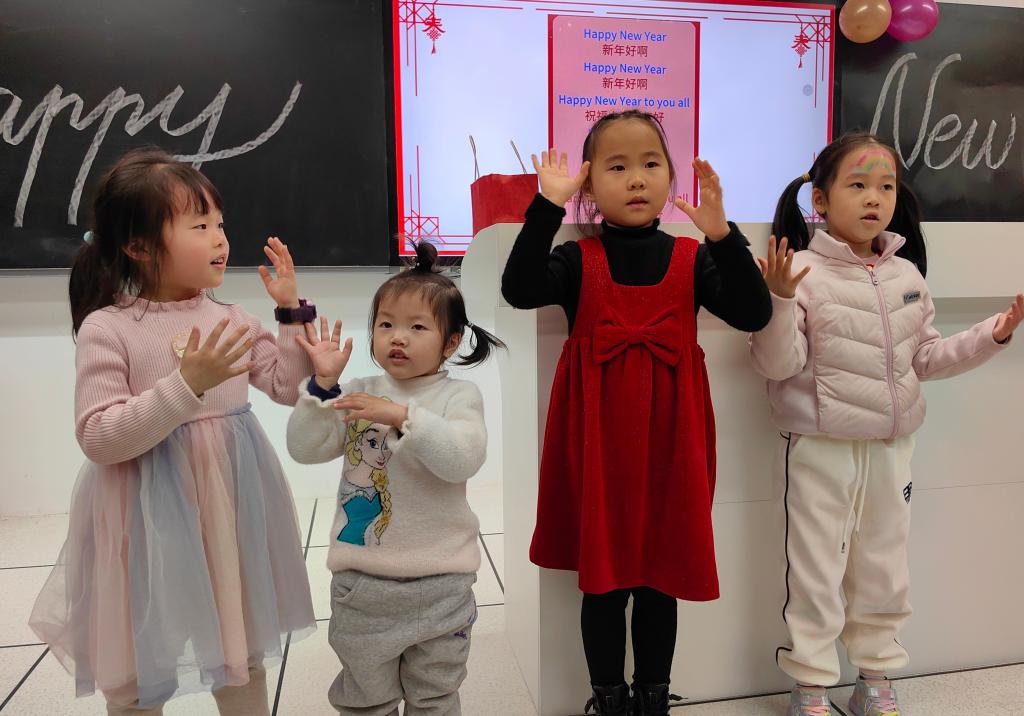随着夜幕降临,小朋友们满怀期待地进入教室,活动以一首欢快的英文歌曲“Happy New Year”开场,由莫钰萌同学带领。在她的耐心指导下,孩子们不仅学会了歌曲,还学会了用手势舞来表演,教室里充满了歌声和欢笑。