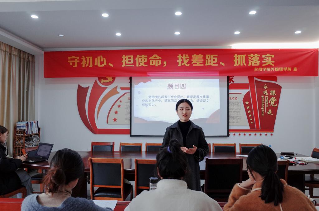 活动中,各党员围绕文化软实力、人类命运共同体、绿水青山就是金山银山、担当精神等话题进行阐述。任佳莉在演讲中指出,在经济日益发展的今天,增强文化软实力的重要意义不言而喻。我国应加大文化创新建设,积极倡导大众的、包容的文化,让中国文化真正走向世界。潘苗苗则另辟蹊径,通过自己亲人从使用塑料袋购物到菜篮子转变的例子,向大家阐述了爱护环境的重要性,以语诉心,收获了热烈的掌声。现场老师和同学从演讲内容、语言表达、形象风度等角度进行打分,全面检测参赛选手的逻辑思维、政治基础、宣讲技巧等能力素质。