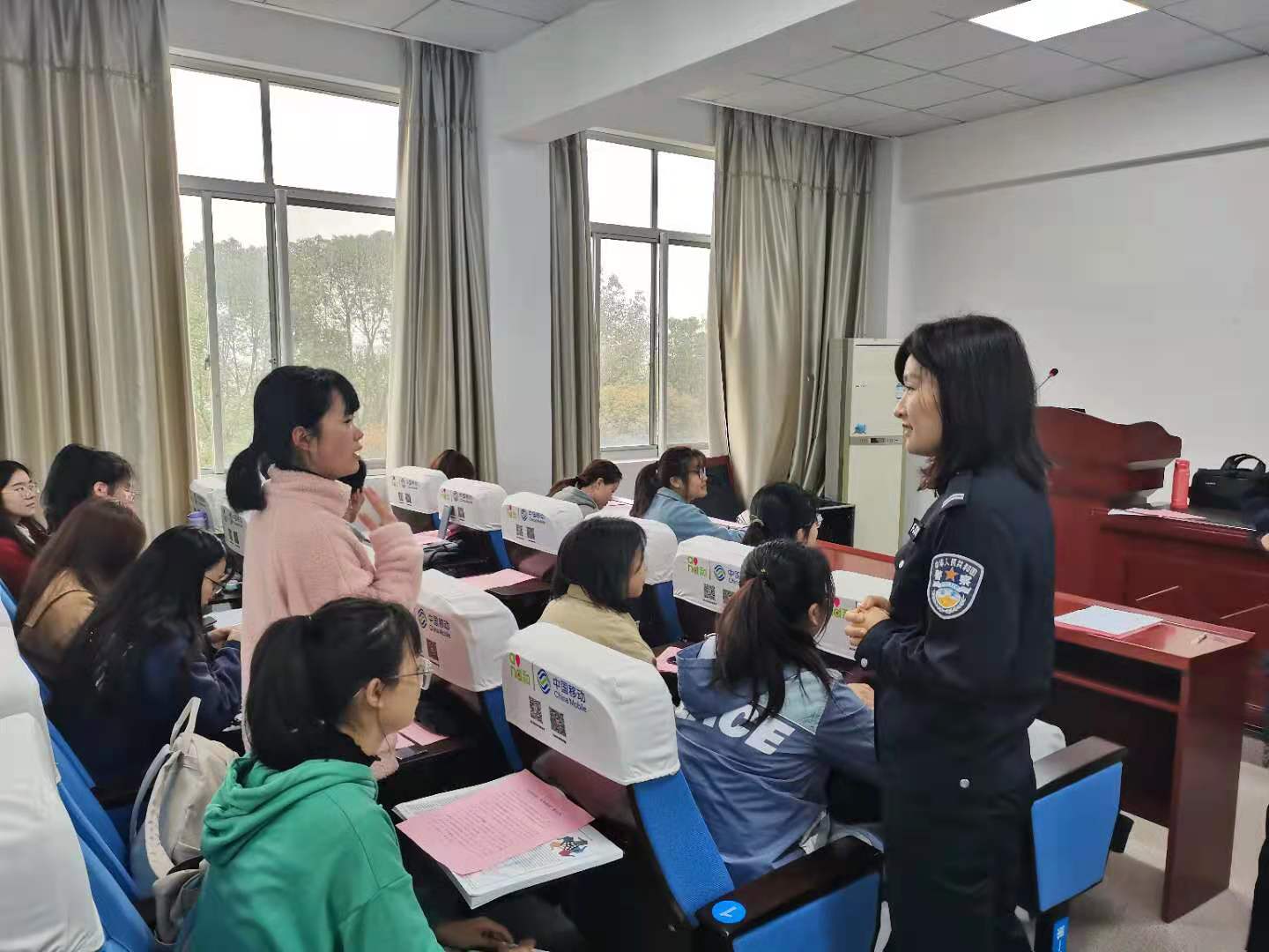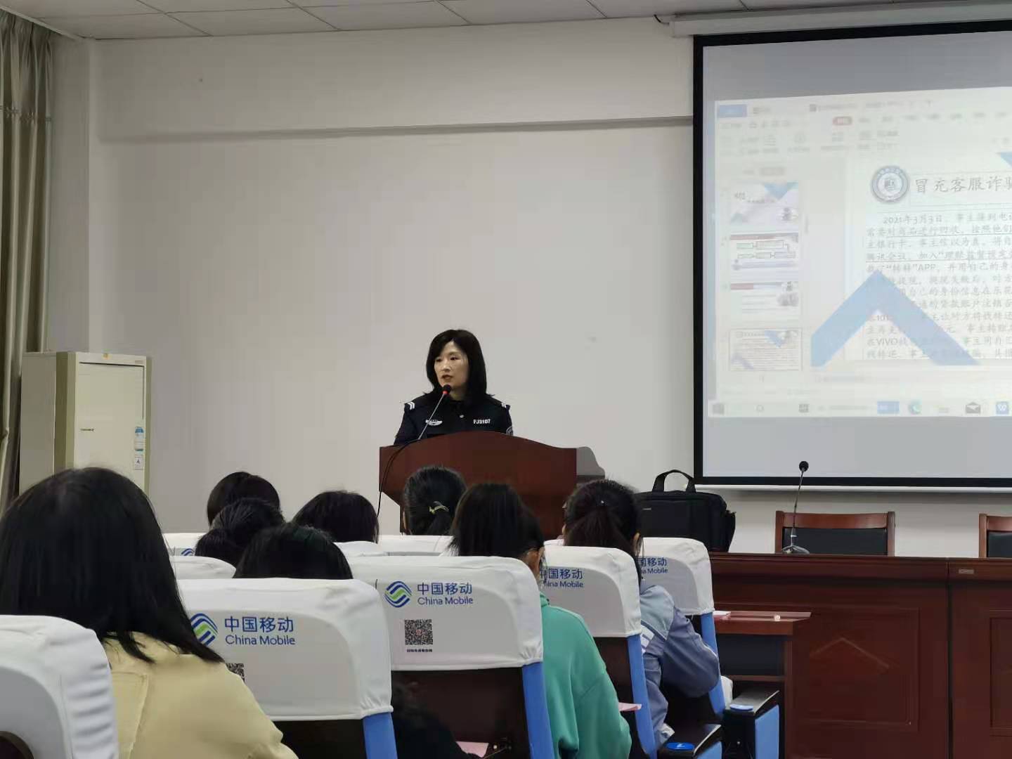 徐警官通过介绍网络诈骗流程,强化同学们的防诈意识。随后她普及游戏交易诈骗、网络客服诈骗、淘宝客服诈骗、金融客服诈骗及兼职刷单诈骗等各类诈骗形式,提醒同学们加强防范意识。会末,主讲人介绍了应对微信及支付宝诈骗的措施。