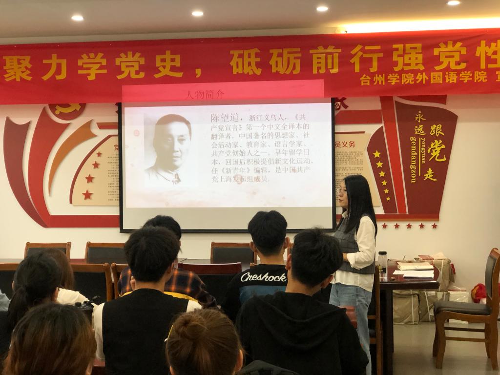 同时,支部书记从文本对比的角度,为同学展示了陈望道译本影响深远的原因:准确传递了马克思主义精髓,如首次将Bourgeois和Proletarians翻译为有产者和无产者;用白话文而非文言文进行翻译,适合大众普及与传播等。作为外语专业学子,党员们被陈望道先生的专业执着精神、兼收并蓄的精神和开拓创新精神深深打动。随后,党员们纷纷分享了自己从书本、媒体等渠道学习的党史故事,畅谈感想体会,传承红色基因。