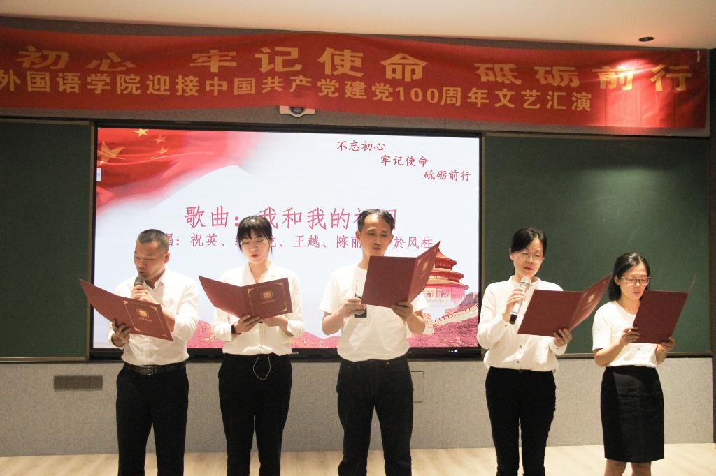意昂经理刘宏照首先致辞,希望各位在座的党员能够对党的历史和党的精神有更加深刻的了解,祝愿本次文艺汇演完满举行。文艺汇演正式开始,老师们和同学们上台表演节目,在节目中回顾革命史。张新杰老师的独唱《太行颂》纪念抗战时期英勇的太行山儿女的独唱;吴佳与、朱欣怡等同学的朗诵《少年中国说》呼吁中华少年奋发进取;鲁建波、许颂捷等老师的朗诵《七律·长征》赞美红军长征。