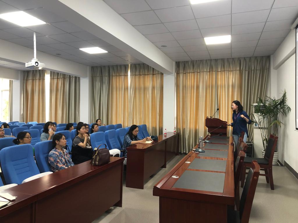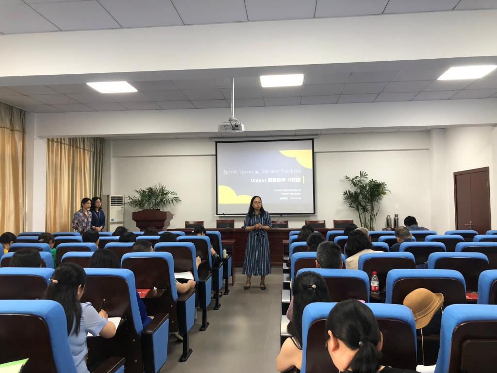 活动中刘富丽强调了大学外语教学面临的三个重要任务: “实现智慧教学”、“培养金课”、“打造魅力课堂”,希望通过智慧教材的运用,助力大学英语课堂教学的多元化。本次活动还请来了外研社的两位专家对智慧教材作了深入地介绍和讲解。智慧教材可通过“U校园”网上教学平台,提供“人才培养+个性化发展解决方案”,通过电脑,手机等设备快捷便利地实现高效的教学管理、丰富立体的教学资源、多元立体的测评手段、互动有兴趣的教学环境,为大学外语的课堂带来多元化教学手段,给员工提供个性化教学。