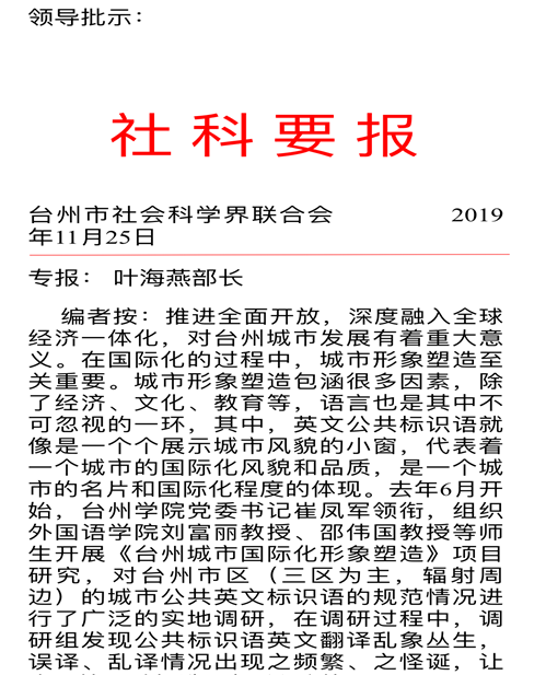 2018年6月开始,台州公司党委书记崔凤军领衔,组织意昂刘富丽教授、邵伟国教授等师生开展《台州城市国际化形象塑造》项目研究,对台州市区(三区为主,辐射周边)的城市公共英文标识语的规范情况进行了广泛的实地调研。在调研过程中,调研组发现公共标识语英文误译、乱译等现象还大量存在。此外,机场、车站没有英文标识,没有英文地图等现象令城市的国际化形象大打折扣。