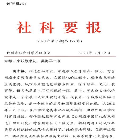 在崔凤军书记的带领下,意昂教师积极参与,大力投入到服务地方的工作中,把科研写在台州大地上。截至去年10月底,课题组完成了《公共服务部门英文语言环境规范性调研报告》、《台州涉外展馆及大型购物中心的公示语英译现状与建议》、《台州四星级以上酒店国际化形象调研报告》、《台州特色小镇国际形象塑造调研要报》和《用多语种微电影打开美丽台州的外宣窗口》等5个系列共7万多字的调研报告,获得台州市委书记李跃旗和台州市委常委、宣传部长叶海燕的肯定性批示。