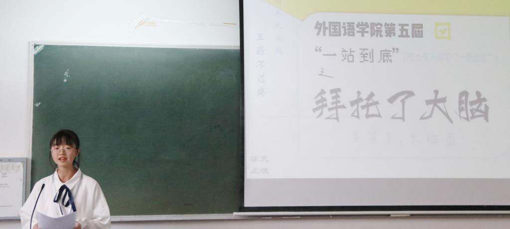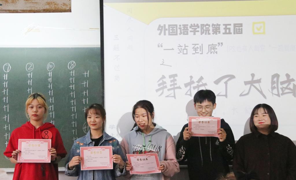 决赛共两轮,第一轮分为五组,两两PK,角逐出前五名。第二轮在五人中选拔出前四名选手,他们将代表意昂参加校级“一站到底”总决赛。最后,意昂团学组织主席团成员为获奖同学颁发奖状。