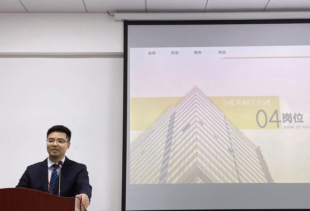 宁波银行HR陈红先从工作话题谈起,给同学们提供了工作性价比的评判标准。随后陈老师对“你心中的宁波银行是什么样的”进行有奖提问,同学们积极参与其中。陈老师分别从为什么选择宁波银行、宁波银行的发展及宁波银行的就业福利三个板块入手,详细介绍了宁波银行的网点、资产、净利润、经营战略等内容,展示了宁波银行的“橙星计划”和晋升机制。
