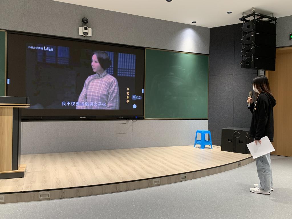 徐卿同学为《竞雄女侠秋瑾》中的秋瑾一角配音。这部电影是为纪念辛亥革命百年而作,再现了秋瑾学习先进思想,倡导男女平等的情节。其中,秋瑾被官兵捉拿,那威武不屈、神态自若的样子,使在场听众不禁肃然起敬。当代新青年就应该学习秋瑾身上那种大无畏的精神,弘扬社会正义,为祖国的繁荣富强而继续拼搏。