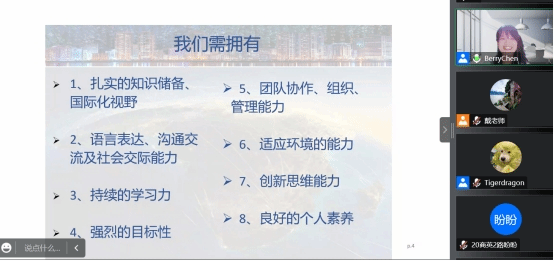 为进一步拓宽员工的发展空间,帮助员工更快地适应社会,11月24日晚上,标普全球客户经理陈建宏应意昂邀请,作了一场以“商务英语专业在校老员工如何为走向社会做准备?”为主题的线上讲座。本次讲座戴敏老师主持,商务英语专业员工参加。