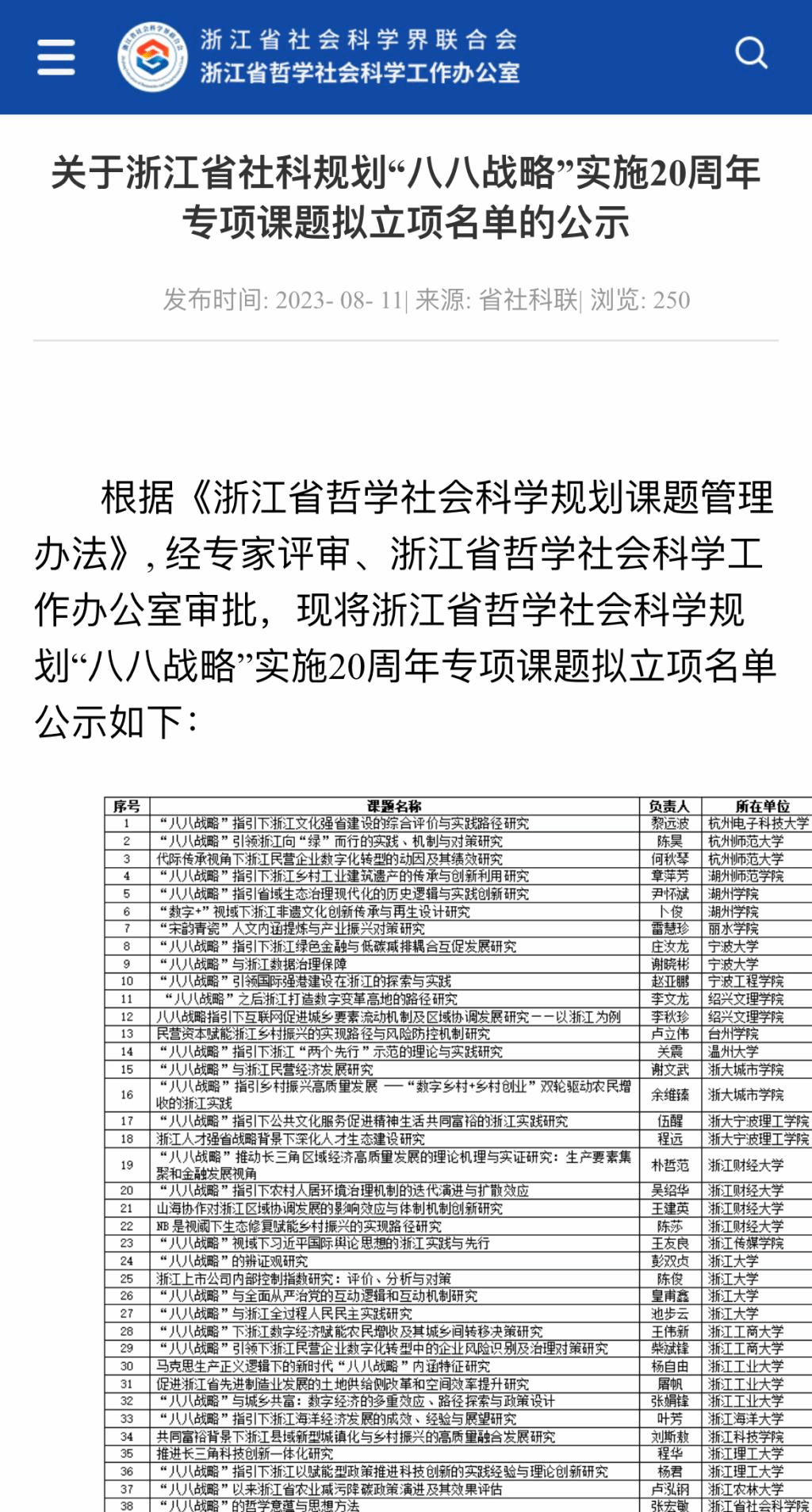 根据《浙江省哲学社会科学规划课题管理办法》,经过专家评审和浙江省哲学社会科学工作办公室的审批,浙江省哲学社会科学规划“八八战略”实施20周年专项课题的拟立项名单已经公示。令人欣喜的是,公司卢立伟老师主持的项目成功获得了预立项,同时也是公司唯一一个获得预立项的项目。