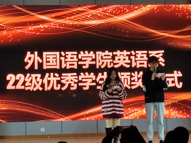 表彰大会开始,英语系主任刘常民致辞。他首先介绍了到场的VIP(very important person,即重要人物)们:2022级和2023级英语系同学、任开兴教授和钱虹博士及方国莲老师,然后介绍了英语系的悠久历史和不凡现状,盛赞了同学们的优异表现,最后表达了“语连世界,译达你我”的美好愿望。接着,为在2022至2023学年德育、智育、体育和能力表现突出,综合考评名列前茅的员工进行颁授一等奖、二等奖、三等奖。不同于以往,本次表彰大会采用新生为老生颁奖并送上精美小礼物的形式。这样做,一方面可以增加参与,完成颁奖,另一方面,这也是对新生的一种激励。最后,任开兴教授送上了教授寄语。任教授从意昂全国排名、翻译类期刊发文数、翻译教学团队和翻译精品课程、英语系教师翻译大赛获奖等方面介绍了英语系取得的成果,然后阐述了AI技术对美术、播音、传媒、翻译带来的挑战,继而通过丰富的例证提出了ChatGPT等AI(artificial intelligence,即人工智能)翻译技术所产出的译文是否完全可靠的疑问,最后提出忠告:AI对任何行业都带来一定影响;AI的记忆力胜过人类,但人类的智力超过AI,二者不是相互对立,而是相辅相成;在与AI共舞中,人类始终是领舞者;只有打好语言基本功,积极拥抱AI,使之更好地为人类服务,才能立于不败之地。