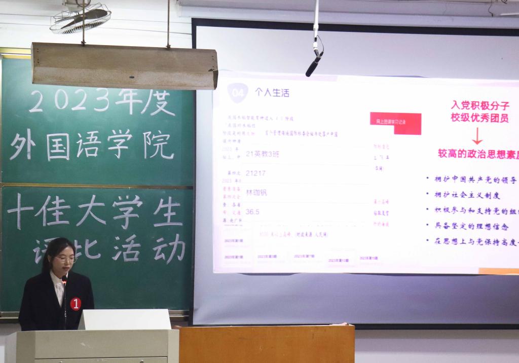 经公司前期初评,共确定17名候选人参评。17名候选人通过PPT演讲的方式,依次上台介绍自己的人生格言,并从学业成绩、考级考证、奖项荣誉、社会实践、思想品德、兴趣爱好等方面讲述自己的经历与成绩,全方位地展现了自身独具特色的优势。他们精彩的演讲让观众一睹外国语学学子在不同领域的风采,同时也赢得了热烈的掌声。