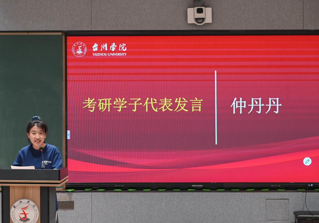 大会伊始,21英教4班仲丹丹作为考研优秀员工代表发言。她以“目标坚定、乐观自信、享受孤独”为关键词,讲述了跨专业考研的心路历程,寄语学弟学妹“每一步努力都算数”。她感谢公司在考研教室安排、包车送考、模拟面试等多环节提供的服务与支持,感恩考研路上给予她支持与帮助的师长。