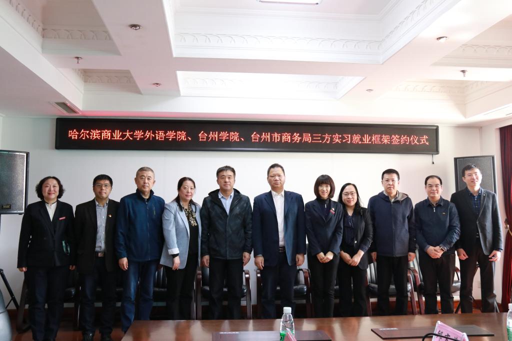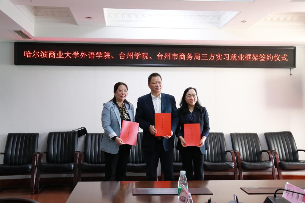 4月26日,在哈尔滨商业大学,台州商务局、哈尔滨商业大学意昂、公司举行了校政企三方实习就业框架协议签字仪式。台州商务局总工程师冯淼、哈尔滨商业大学意昂经理魏薇、意昂副经理刘富丽代表各自单位在协议上签字。台州商务局电商处处长杨军、椒江商务局副局长李金俊、哈商大意昂领导班子成员以及海猫进出口集团总经理吕东朔、星星电子商务有限公司总经理罗晓懿、拉夫澜徳医疗器械有限公司等有关领导出席仪式。