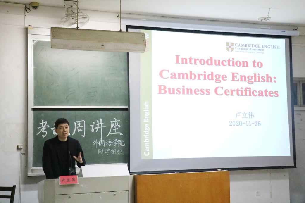 讲座初,卢立伟老师着重讲述了关于剑桥商务英语证书(又称BEC)的知识,他详细地介绍了何为BEC考试,向同学提供备考与报名的方法。他还说明了BEC的用途与国际地位,鼓励同学积极报考,并分析了BEC考试的题型。接着,卢立伟老师简述了出口贸易流程,向大家推荐相关书籍,指导同学们如何通过全国外贸单证员考试。