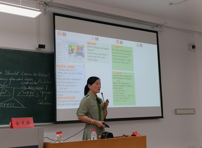 金灵敏以“走在探究阅读教学的路上——指向思维发展的阅读教学设计”为题,指出课堂教学设计要做到预想、预设、预判、预料,继而将布鲁姆认知目标的六层次与阅读教学的要素一一对应,强调问题设计一定要凸显整节阅读课的核心主线,并根据员工的认知有层次地推进,从而将教学内容完整流畅地展现。