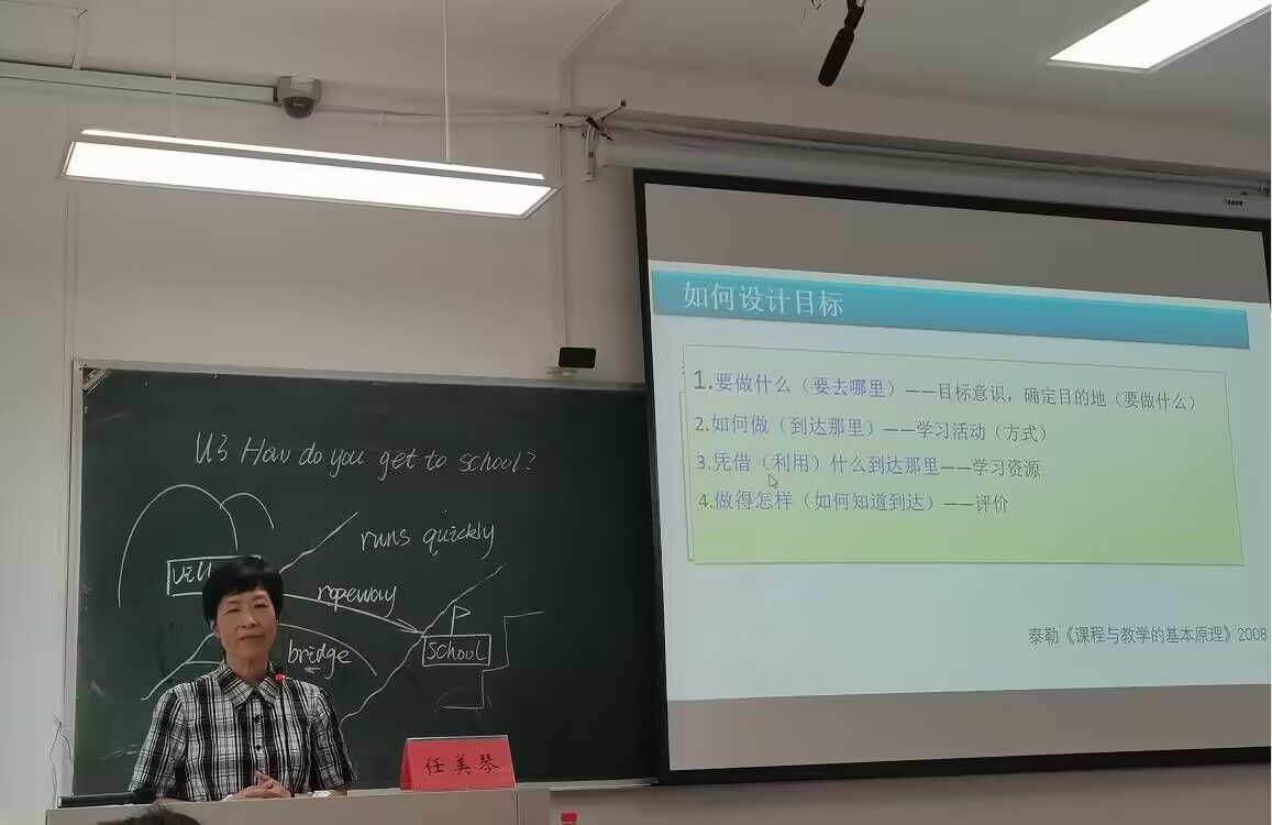 任美琴以“基于目标的英语教学设计”为题,强调“达成目标的教学评一体化的教学设计”的重要性,通过研读义务教育英语课程标准,分别以中小学英语教材中的具体课文为例,讲解设计课程目标,层层细化,对目标进行逐级分解的方式方法,继而突出重难点,设计任务,完善教案与课件。