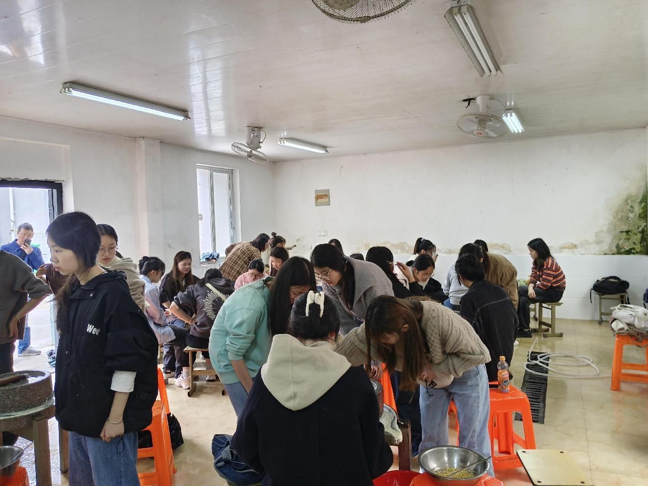 活动伊始,同学们冒雨在广场集合,聆听农校负责人介绍琳山文化及其代表人物朱冼教授的感人事迹:朱先生推广卫生事业,建设家乡,将荒山变成综合性果园;在教育方面,他编著教材,聘请名家讲学……同学们无不被其高尚的精神打动。此后,由于天气原因,同学们简单参观了劳作园,品尝园里出产的红薯和芋头。最后,同学们分组轮流体验了豆浆和陶艺制作以及蛋糕烘焙等劳动实践课程。经过相应负责老师细致、全面地讲解和耐心的指导,大家“分工合作”、“各司其职”,陆续完成各组的劳动成果,不少作品实在精美,可以堪称“工艺品”。